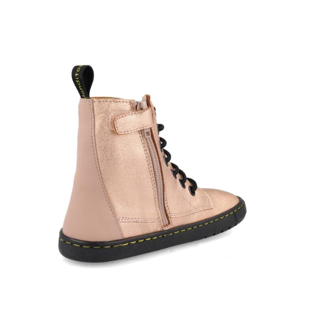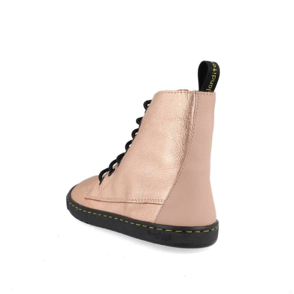 Estas botas barefoot em pele metalizada destacam-se pelo design moderno com inspiração militar. Têm sola preta, atacadores em cordão e fecho lateral em zíper que facilita o calçar. O calcanhar em rosa fosco adiciona um toque delicado e feminino. São leves, muito maleáveis e permitem que os pezinhos se movam livremente, garantindo conforto e liberdade em cada passo.
