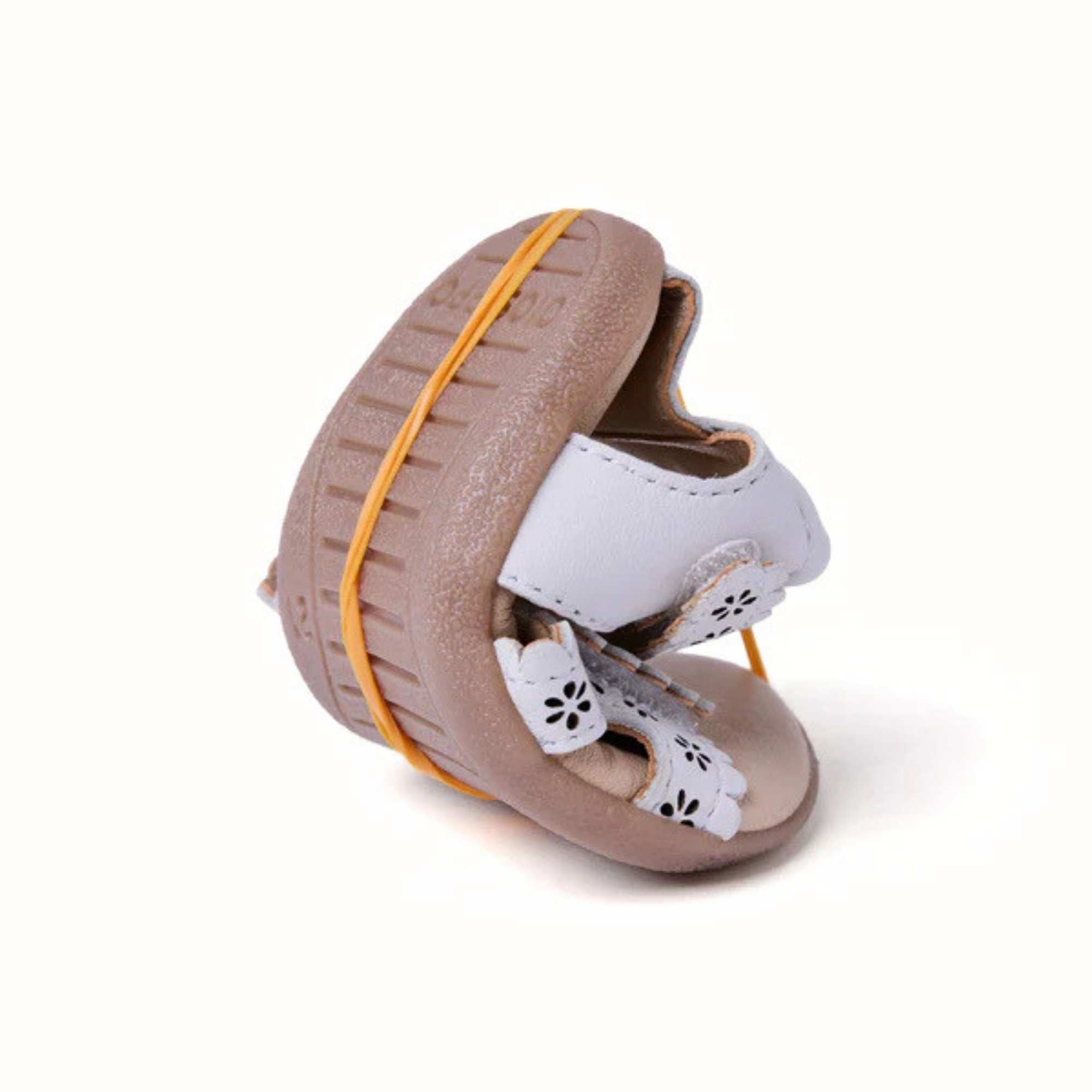 A sola de borracha é plana e flexível, pensada para acompanhar a mobilidade do pé e permitir maior perceção do piso. Numa sandália barefoot, esta proximidade ao chão é intencional: ajuda a criança a ajustar a passada e a desenvolver controlo e equilíbrio. Para conforto em uso prolongado, o mais importante é acertar no tamanho e manter as tiras bem ajustadas, sem apertar.