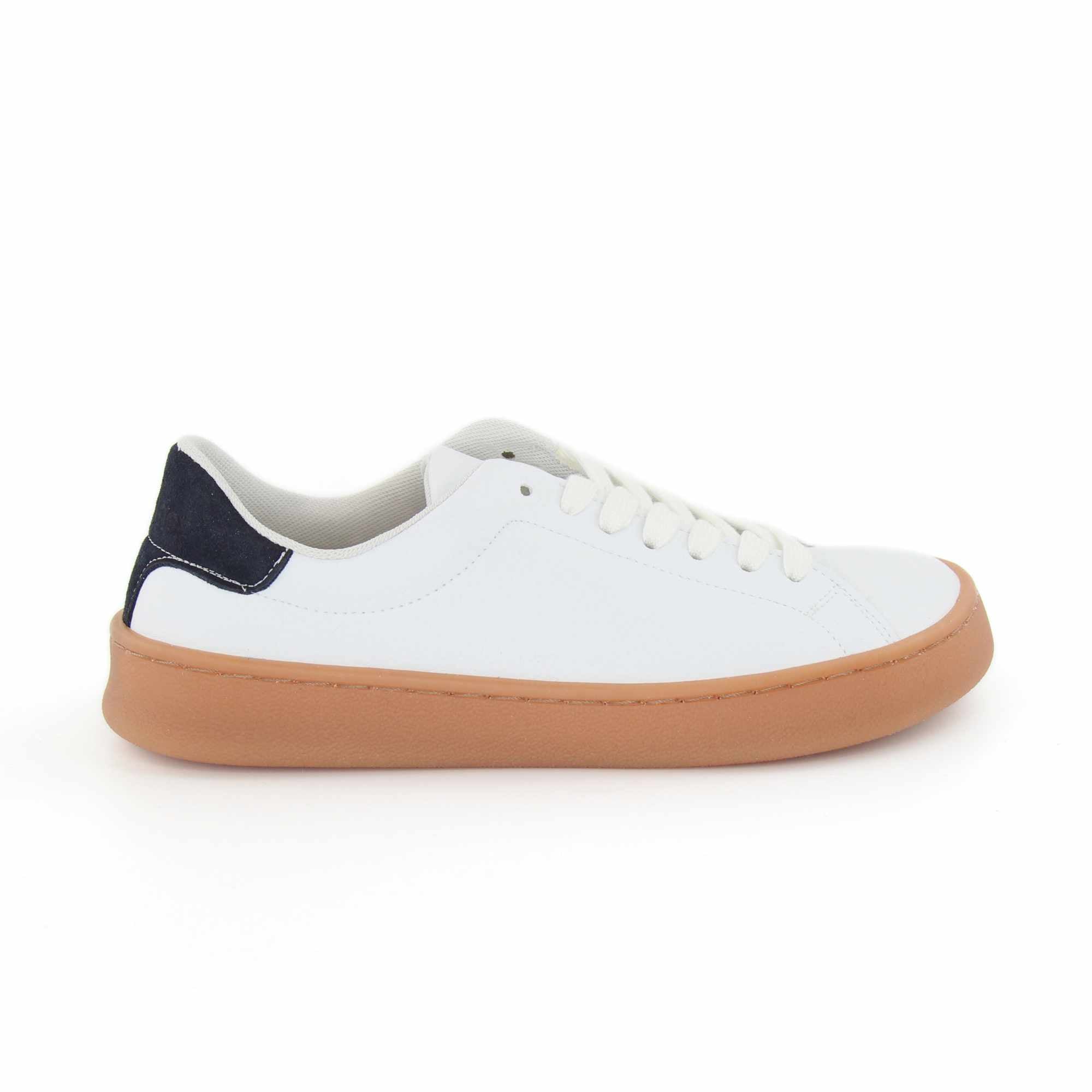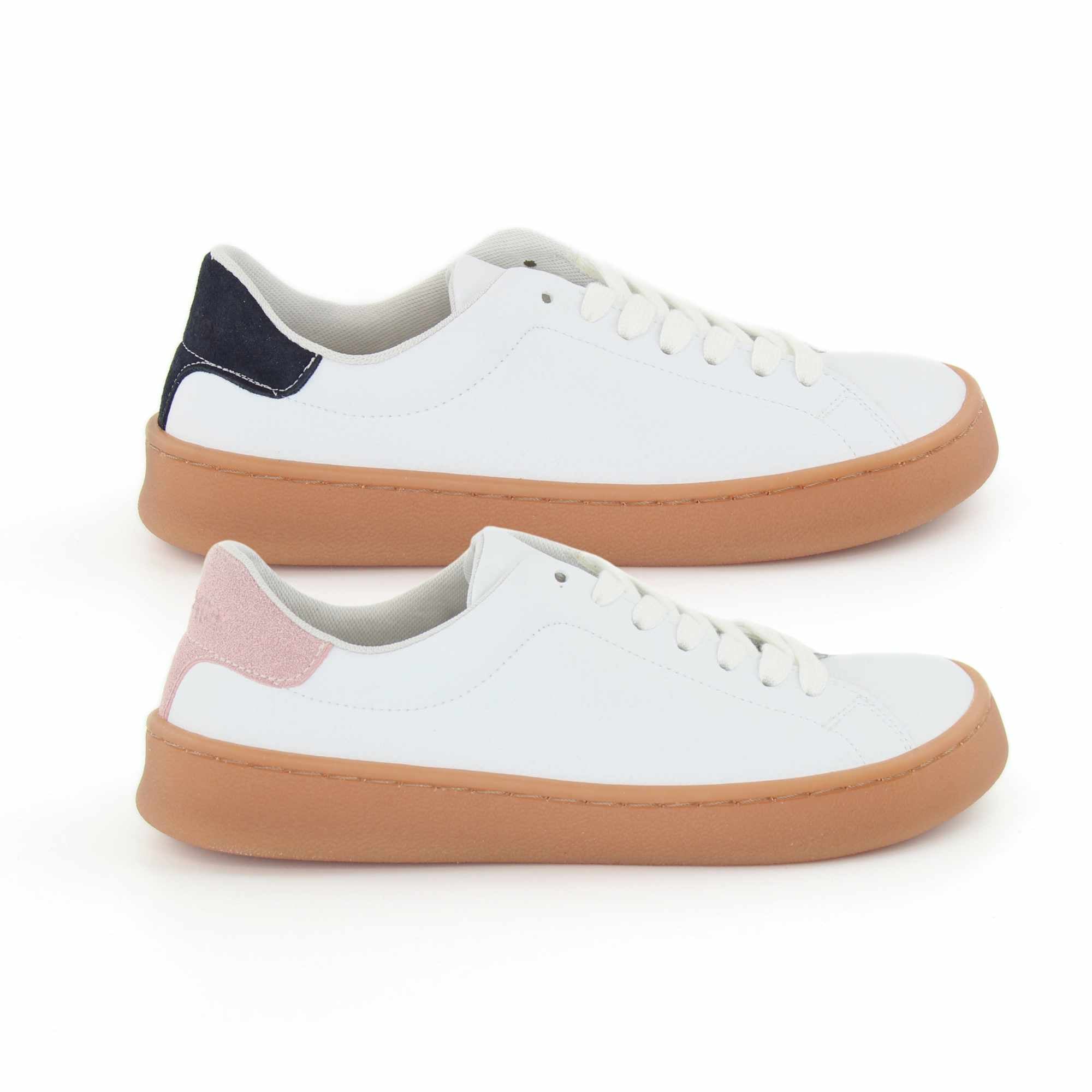 O exterior em pele sintética lisa branca oferece um acabamento limpo e fácil de combinar, enquanto os apontamentos com efeito camurça em contraste no calcanhar acrescentam textura e personalidade. Os interiores em têxtil promovem uma sensação confortável no contacto com o pé. A sola caramelo, além de fina e flexível, apresenta uma caixa que contorna toda a borda do calçado, estando colada e costurada para reforçar a durabilidade do conjunto em uso regular.