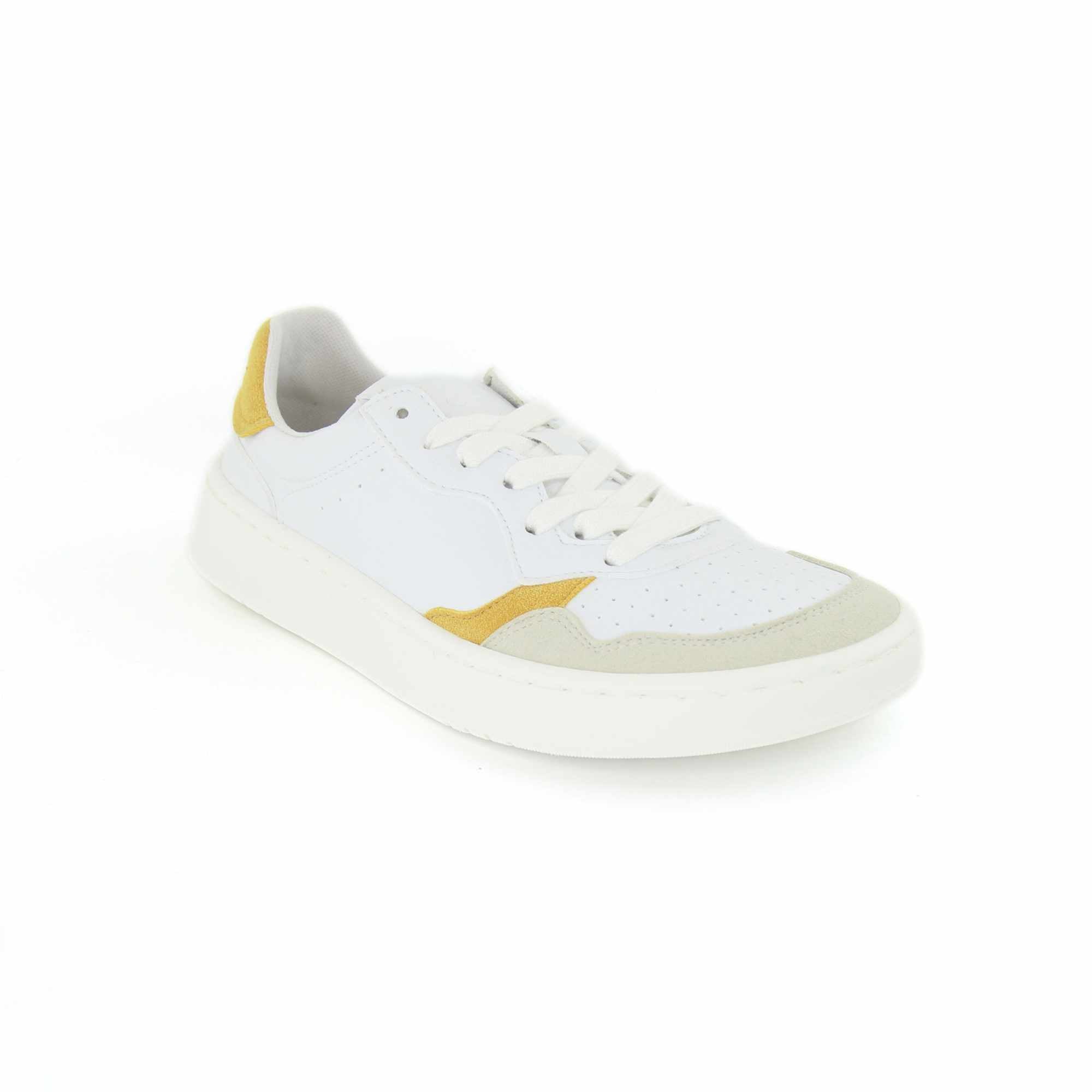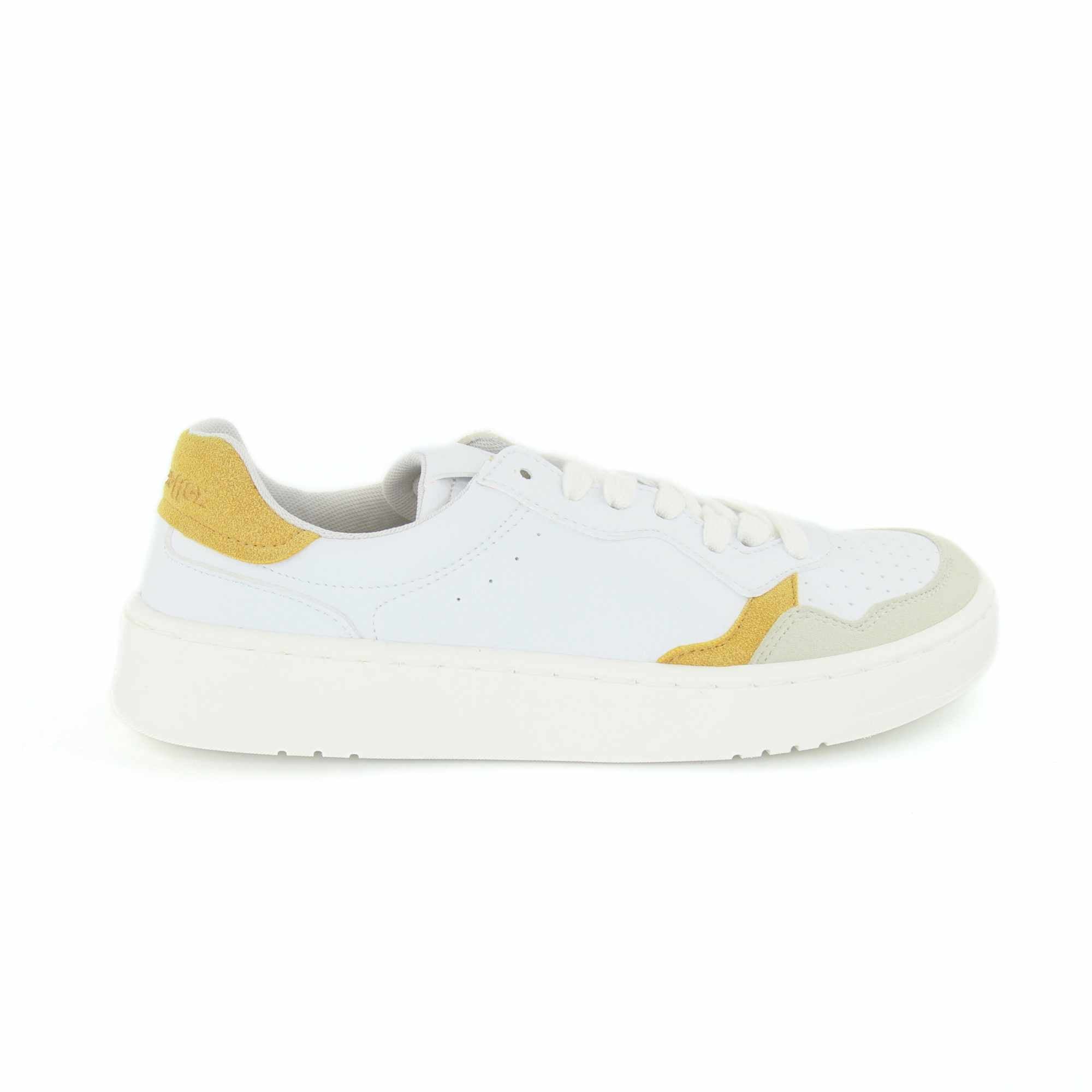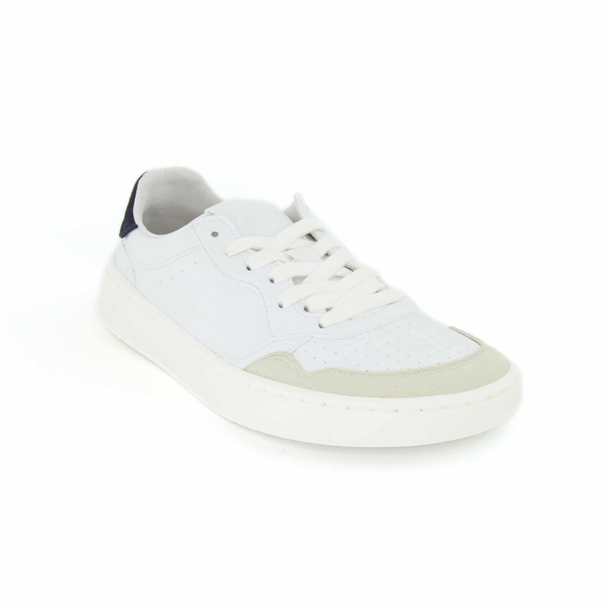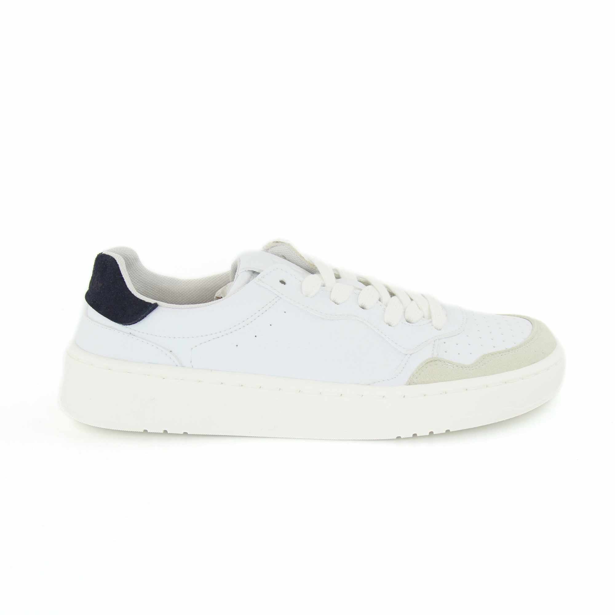 O exterior em pele sintética lisa branca, combinado com detalhes de efeito camurça, oferece um acabamento cuidado e fácil de conjugar com diferentes estilos. No interior, o têxtil contribui para uma sensação agradável no uso diário. A sola é colada e costurada com uma caixa que contorna toda a borda do calçado, um pormenor que reforça a durabilidade e torna este modelo adequado para uso frequente.